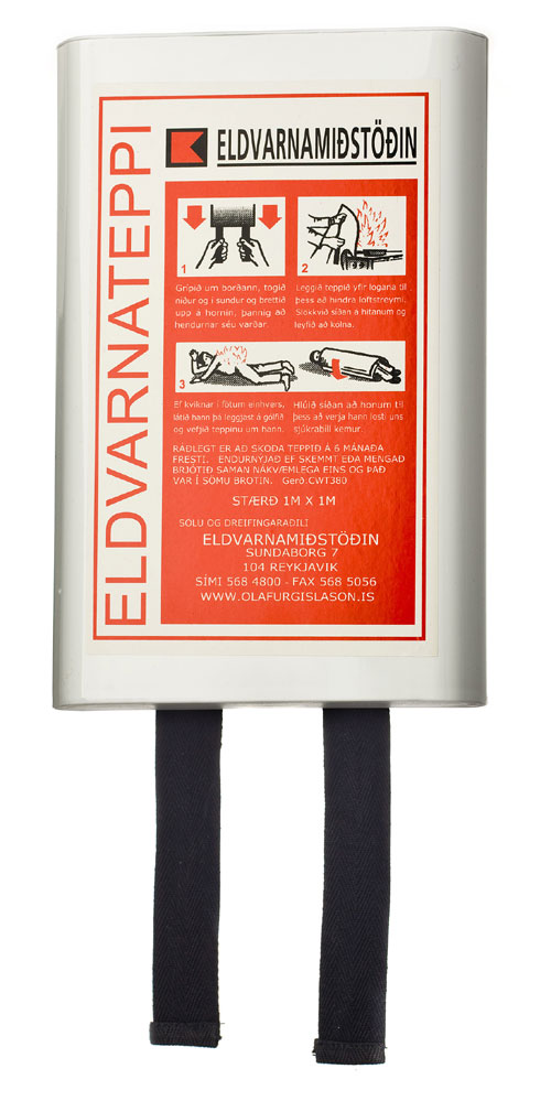 Eldvarnateppi 100 x 100sm. Í hvítum flötum plastkassa. EN staðall. Íslenskar leiðbeiningar.