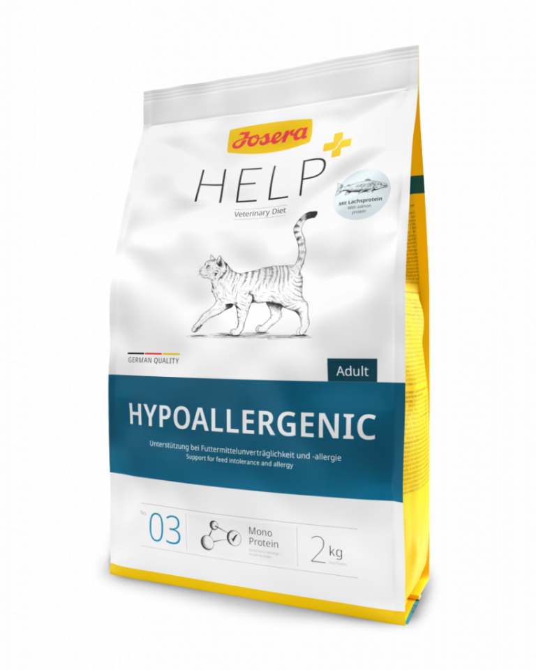 Klórar kötturinn sér oft eða er jafnvel með skallabletti? Þetta eru venjulega einkenni fóðuróþols og ofnæmis – og þú þarft ekki bara að sætta þig við þau. Með Josera Help Hypeoallergenic fóðrinu getur þú hjálpað flauelsloppunni þinni að líða betur. Ofnæmisfrítt sérfæði þolist einstaklega vel þökk sé laxapróteini sem er dýraeinprótein og hentar vel fyrir viðkvæma ketti. Ef grunur er um ofnæmi eða óþol getur útilokunarmataræði hjálpað: Í þessu tilviki er kettinum gefið fóður sem er alveg nýtt fyrir honum. Ef bati verður á einkennum eins og kláða eða niðurgangi meðan kötturinn er á útilokunarmatarræði er mjög líklegt að kötturinn sé með ofnæmi fyrir eða hafi þróað með sér óþol fyrir innihaldsefnum í fóðri sem honum var gefið áður. Með Josera Help Hypoallergenic þurrfóðri getur kötturinn loksins nartað af hugrekki aftur – og gert það kláðalaust.