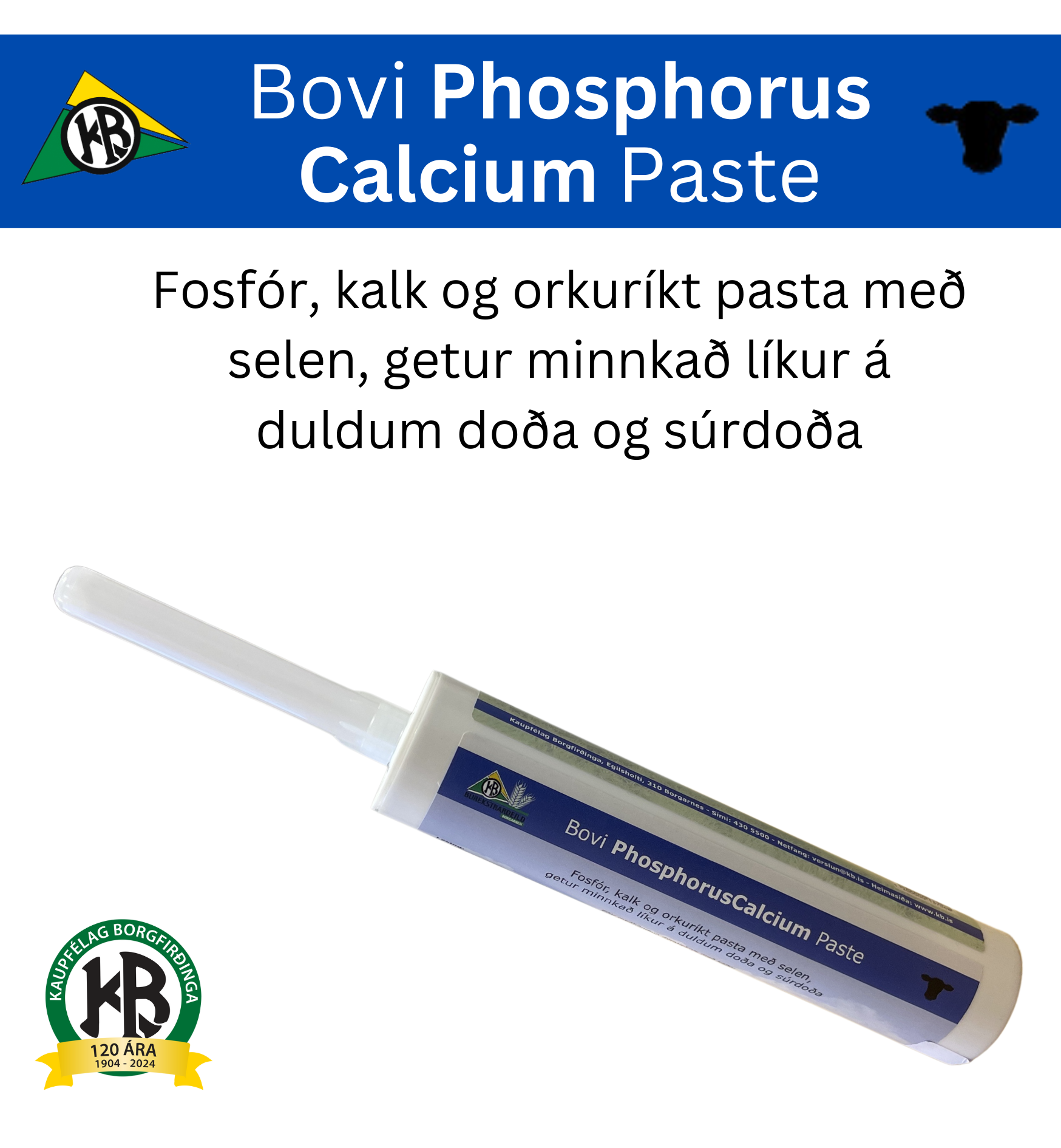 Inniheldur glúkósamyndandi efni og kalk til að minnka líkur á súrdoða og doða. Hver túpa inniheldur 42gr af fosfór og 30gr af kalki.