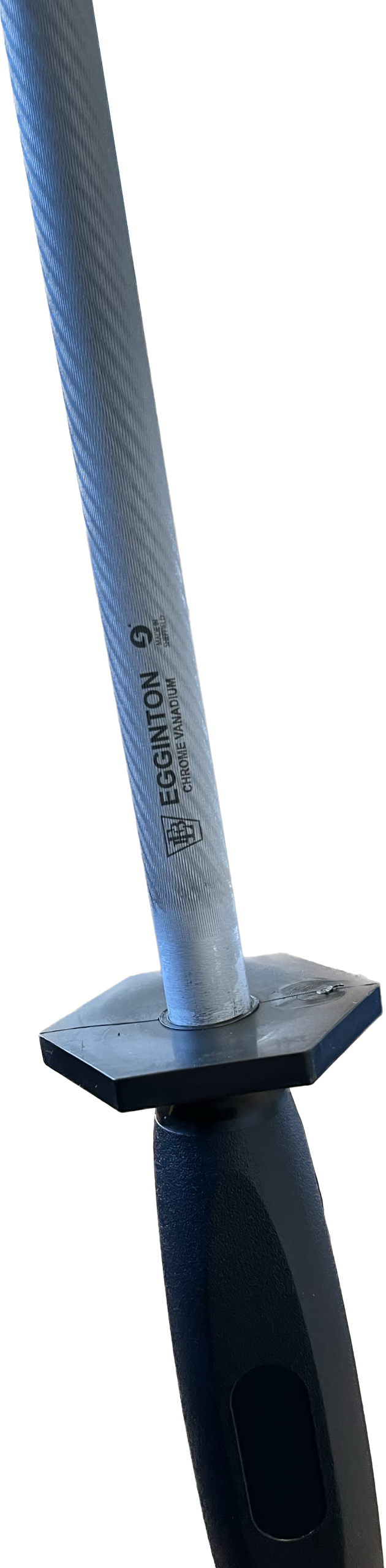 Egginton stálbrýni með svörtuplasthandfangi og stálhring til að hengja brýnið upp.